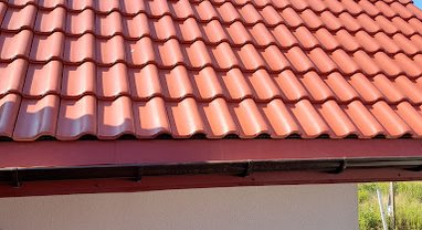 W podstawie litery H z czerwonym dachem z blachodachówki ceramicznej.